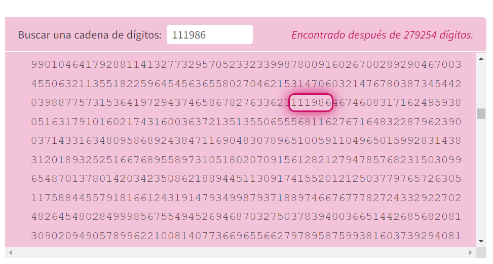 Excelente aplicación, descubierta gracias a @_trastoy al responder a mi tuit anterior. Realiza búsquedas de cadenas de 6 dígitos más allá del primer millón de decimales.